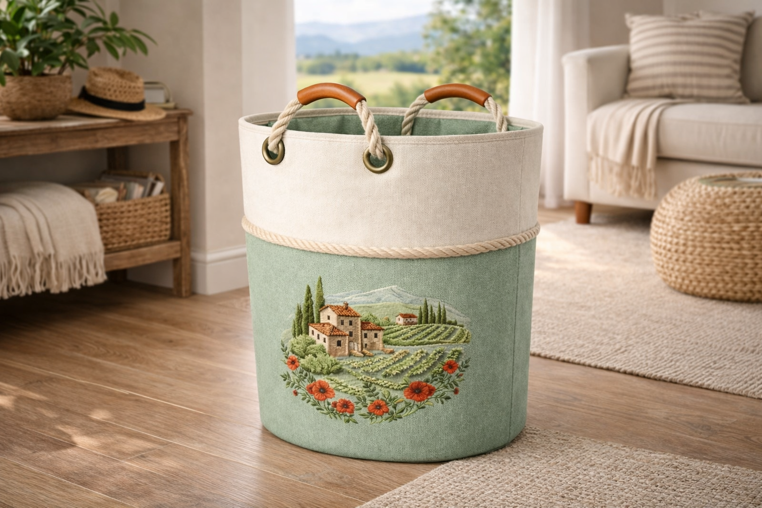 Cesto Decorativo in Tessuto Verde con Motivi Limone e Bordo Ornamentale